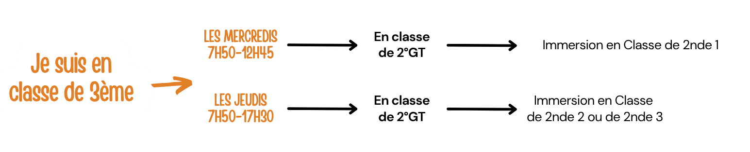 - Jeudi de 7h50 à 17h30 : En classe de Seconde Générale et Technologique → Immersion en classe de 2nde 2 ou 2nde 3 → Immersion en classe de 2nde 2 ou 2nde 3